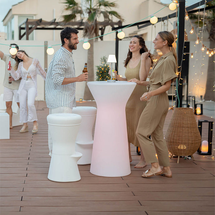 Vamos a comenzar por este conjunto de mesa alta y taburete, que se puede elegir con o sin iluminación. La mesa se recarga por medio de un USB y permite escoger entre luz fría y diferentes colores.