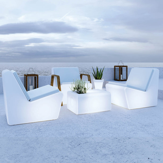 Además, permite elegir entre luz cálida y fría, diferentes colores e intensidades de luz y viene con mando a distancia. Además, la mesa Tarida incluye un compartimento que sirve de botellero, mientras los asientos se pueden escoger con reposabrazos de madera o sin ellos.