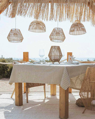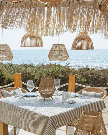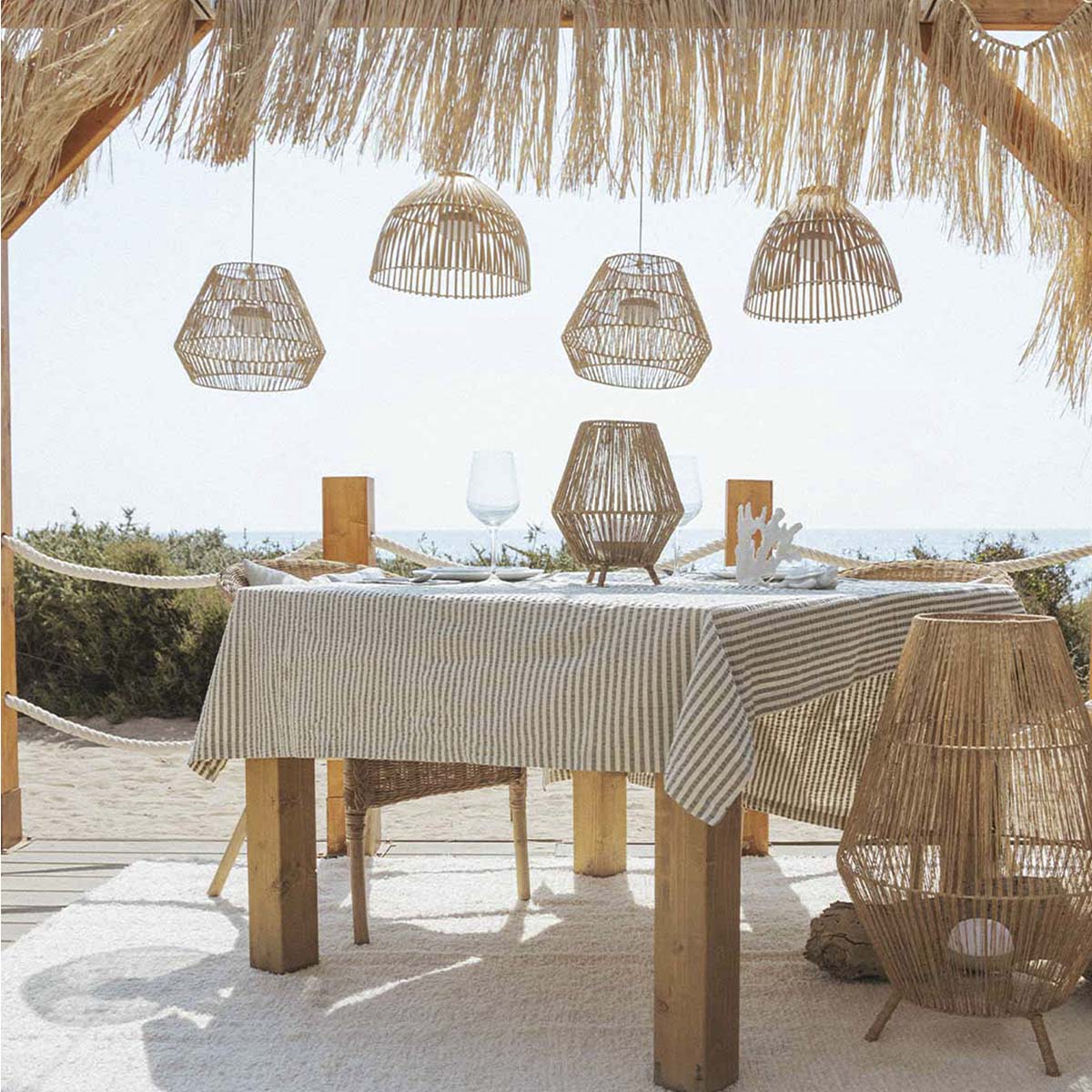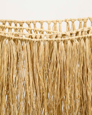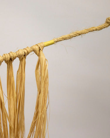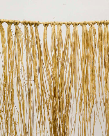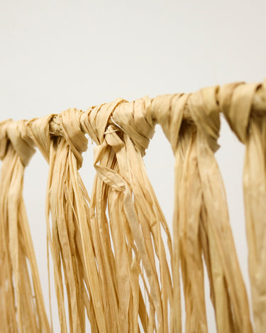 Guirnalda de flecos de rafia natural hecha a mano para exterior. Mide 5 metros de largo y 0,5 metros de ancho. Aporta un toque rústico y cálido a cualquier espacio. Ideal para decorar fiestas o eventos al aire libre. Resistente y duradera.