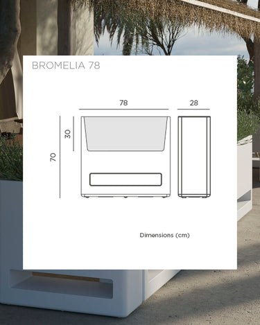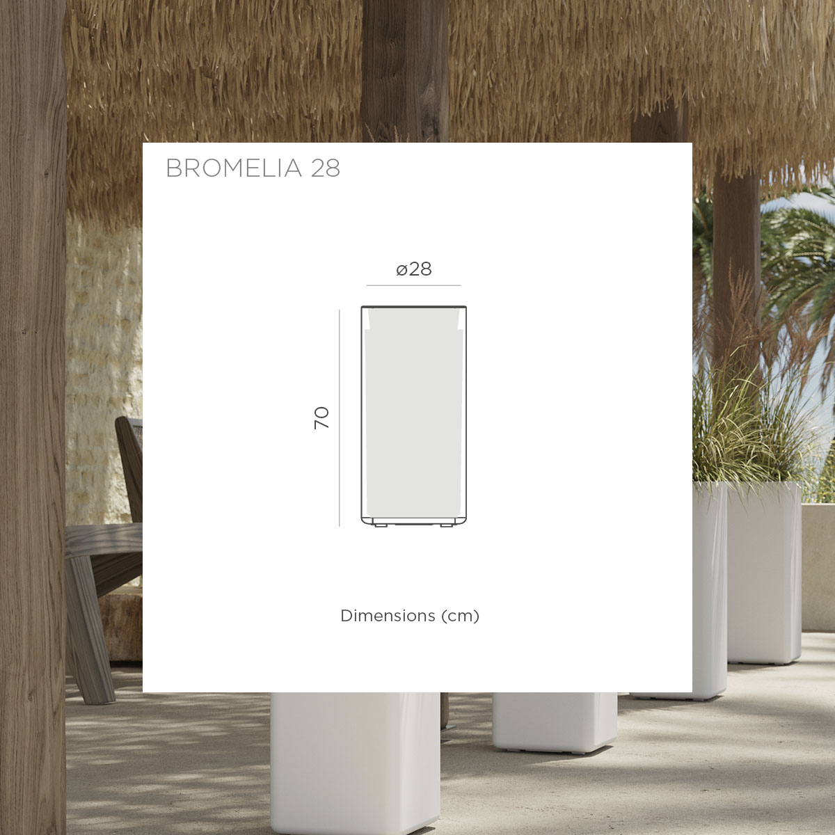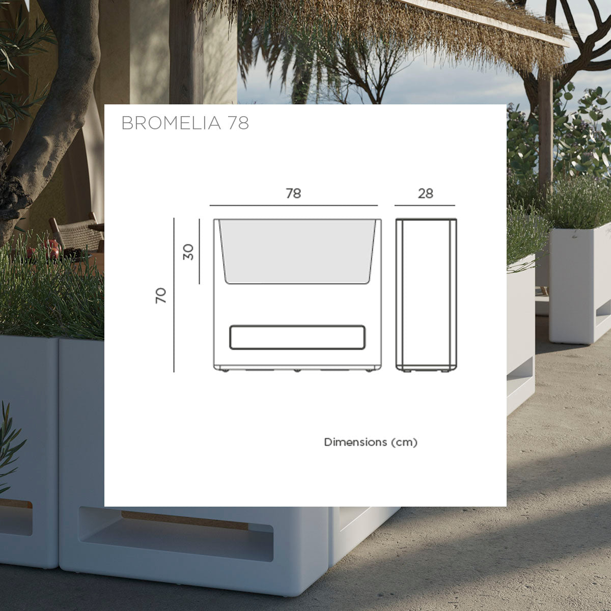Bromelia es una jardinera rectangular de mediana altura, cuenta con una gran superficie de plantación. Ideal para colocar junto a una pared recta y diferenciar el ambiente, restaurante, hotel, terraza o espacios chill out.