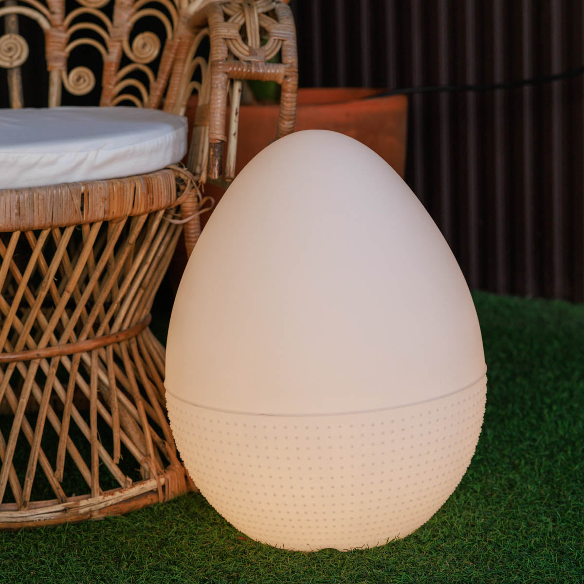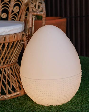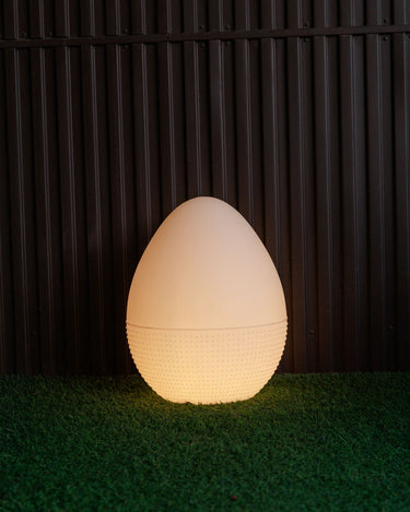 Ilumina tus noches con la divertida LÁMPARA EN FORMA DE HUEVO OVO. Fabricada en polietileno, esta lámpara está disponible con conexión por cable y luz cálida o con carga solar + batería recargable con opciones de luces RGB y blanco. Dale un toque único a tu espacio exterior con OVO. ¡Ilumina tu vida!